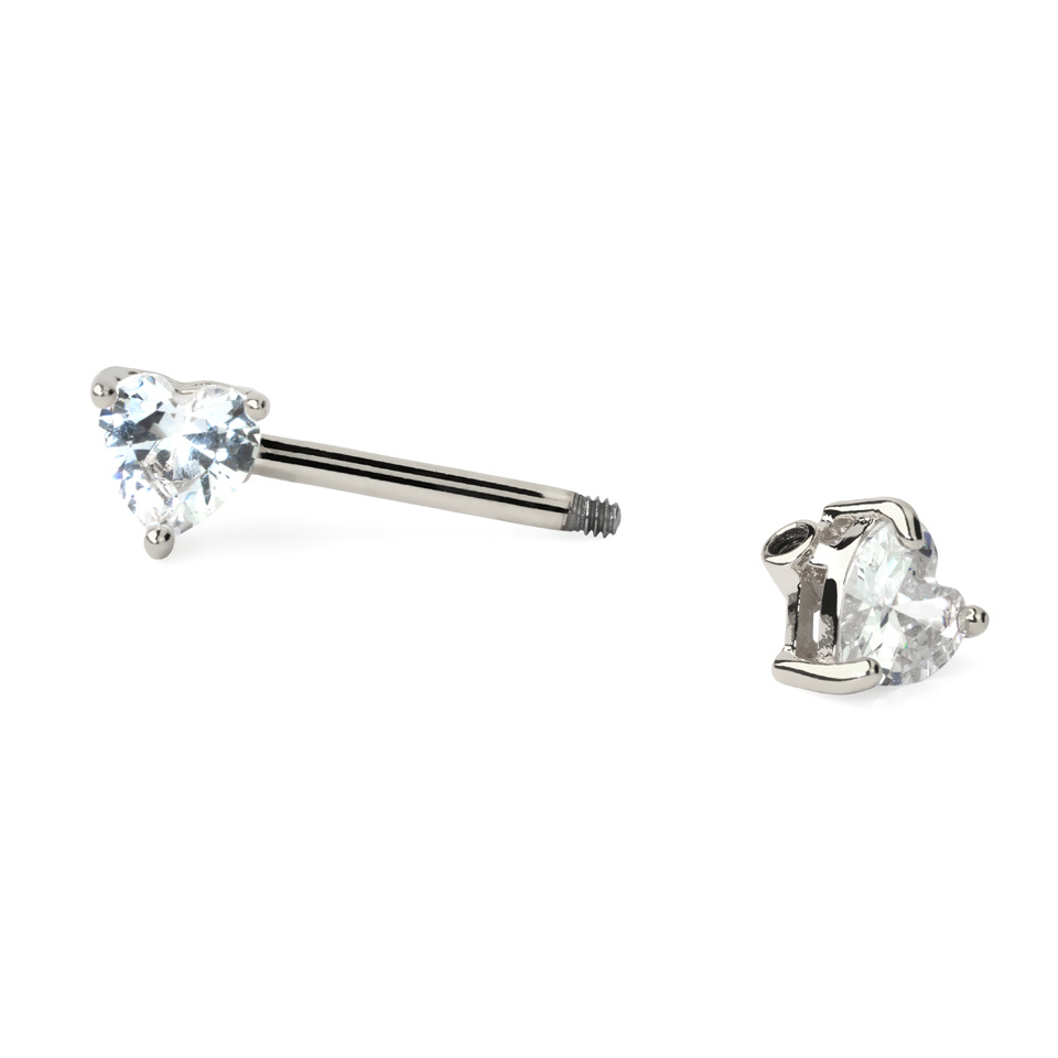 In the featured image, you will see very delicate nipple jewelry. These straight barbells are made of surgical steel, featuring sparkling double prong-set cubic zirconias. You can have these stones in your choice of color. The color selection applies to both the barbell and the heart-shaped stones. You can, for example, choose a rose or yellow gold barbell with blue or red hearts. You are free to combine these options as you like.