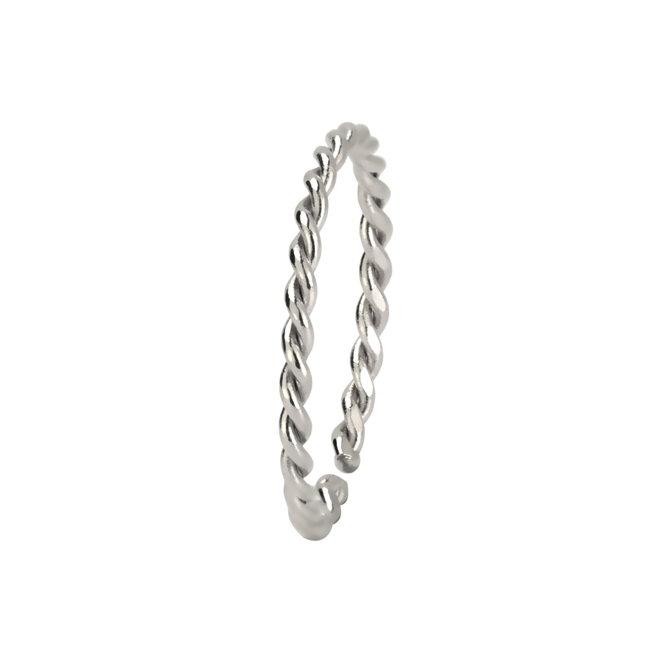 This ring is a different version of the popular seamless hoop. The normal one is a single piece of metal with connected ends. This new version consists of two metallic pieces that have been twisted, getting a braided effect. The ends have been slightly welded and rounded for easy insertion into the piercing and to prevent the parts from breaking apart.