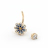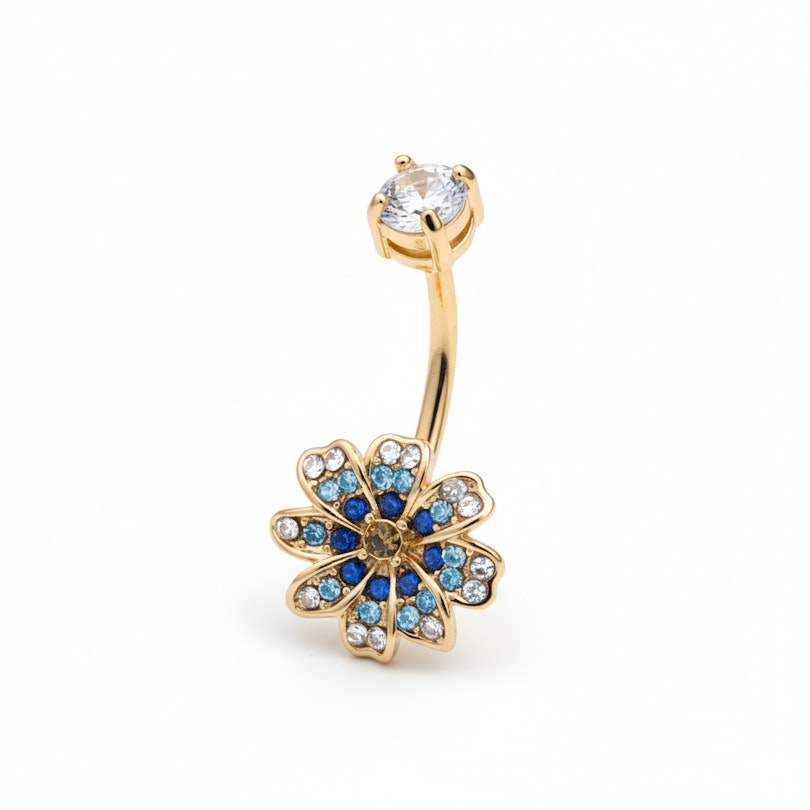 This cute belly barbell is made for crop top season. It features a flower made up of tiny stones in different shades of blue with a central yellow stone. The top ball has a clear stone.