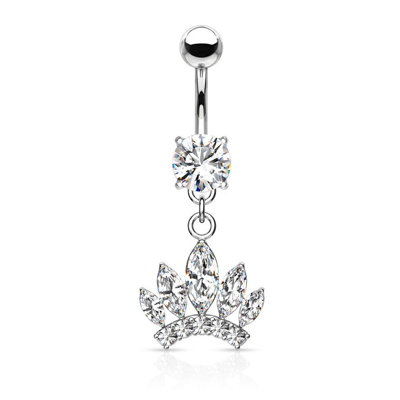 The barbell is made of surgical steel, and the top ball is a regular one, while the bottom ball consists of a sparkling prong-set gem that matches the color of the stones on the crown dangle. You can choose your ring with either pink or transparent gems.