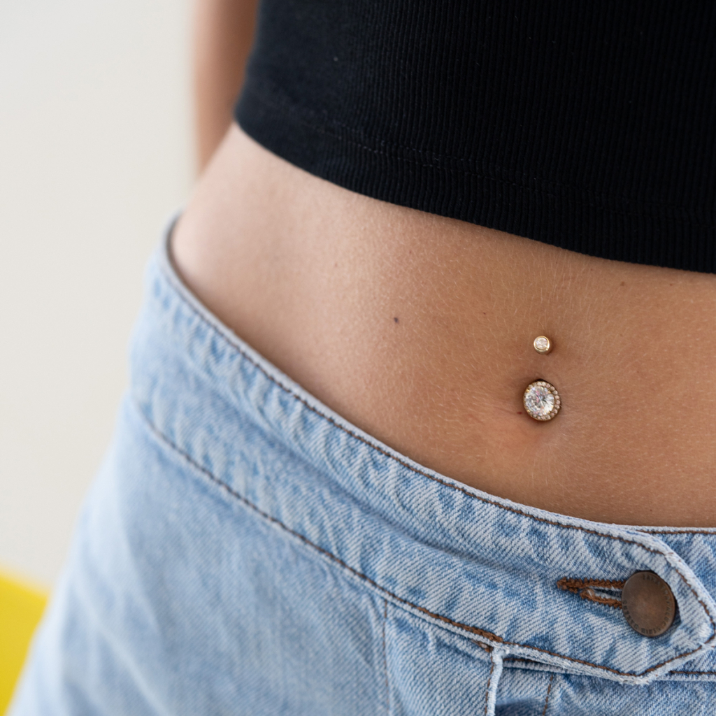 The large faceted stone in the center of the bottom ball is the biggest sinner here - it's the one that will get most of the attention. But this ball is not alone; it's getting help from the little stones encrusted behind and surrounding it. These tiny stones also give the piece a sense of depth, which makes it look even better. To make it even, a stone matches the top ball - we thought of every detail to make this a perfect belly ring.