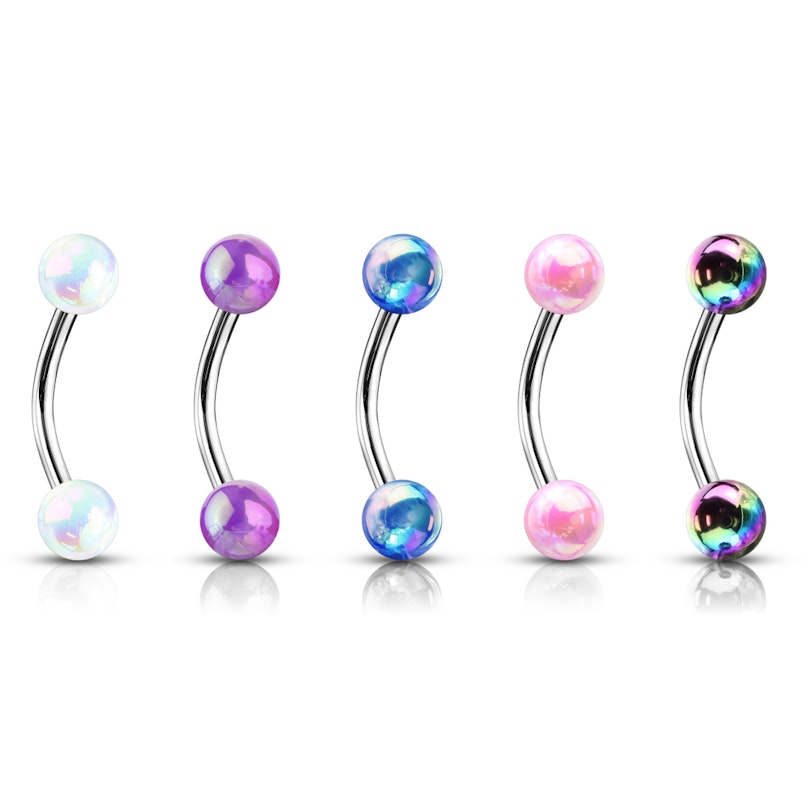 As you can see in the picture above, this curved barbell is available in different options. You can choose both its length size and the ball color of your preference - including purple and blue. However, you will not get a ball in only one color. These balls have been coated in such a way that they don't only reflect a metallic look; they also create a delicious play of colors. That means that if you select pink, for example, you will get a ball with a surface that includes red, white, and other tones related to pink.