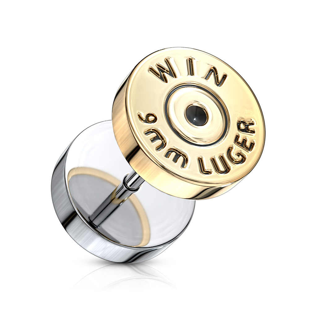 What you see here is a fake plug that resembles the back of a cartridge. The reason why we call it a fake plug is that you can wear it in a normal piercing, that is, in a gauge of 16g (1.2 mm). It's not possible to see the difference between this and a regular plug when it's in the earlobe. The reason why it has a diameter of 3/8" (10 mm) is that the text can be included, just like a real cartridge. It wouldn't be as fun without the text.