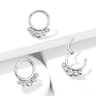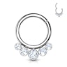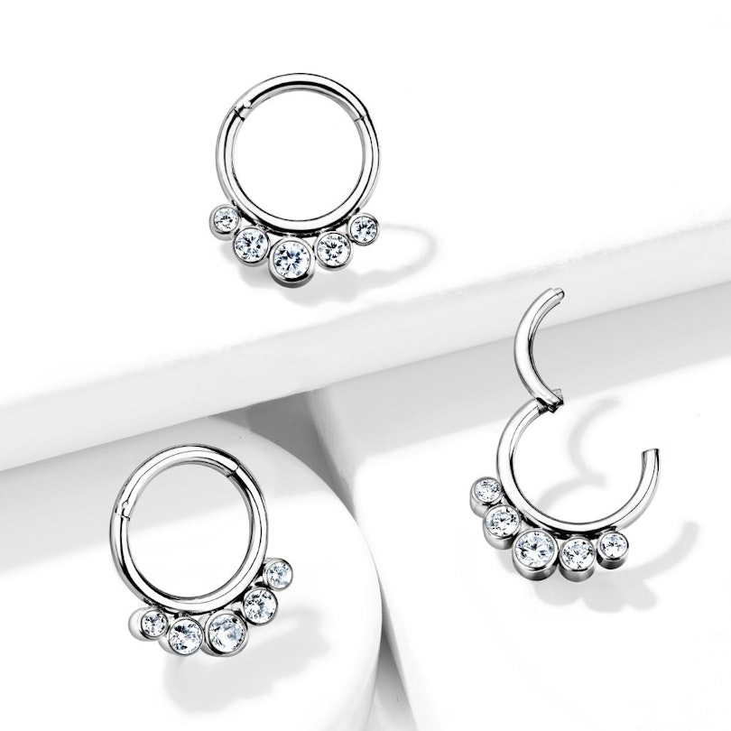 This ring is made of titanium, one of the best materials you can offer your piercing. This is also why it's used for initial piercing jewelry in new piercings. The ring has a gauge or thickness of 16g (1.2 mm) and is available in diameters 5/16" (8 mm) and 3/8" (10 mm). No matter what diameter you select, the ring will have five stones at the bottom. The stone in the middle is the largest and the stones get smaller towards the ends, just like in a curved cluster.