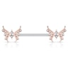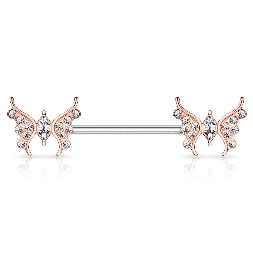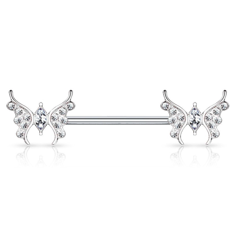 If you're looking for the most special designs for your nipple piercing, we have a beautiful offer. The jewelry consists of a 11/16" (14 mm) straight barbell. At each end sits a small butterfly with beautiful wings. The body of the butterfly has been studded with a small marquise-shaped stone, which actually follows the body shape really well. The wings are studded with little clear stones that match the larger stone in the middle.