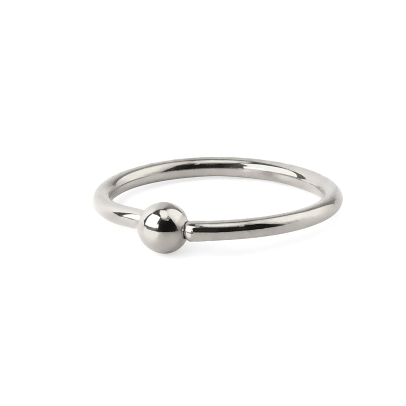 A captive bead ring usually has a ball that is used to lock the ring. The ball should be in tension between the two ends of the ring. The system has its advantages and disadvantages. The biggest drawback is that one can lose the ball. But that won't happen with this ring, as the ball is stuck on one of the ends. Therefore, the ball has no function, it's only for decoration but it will look just like an ordinary ball closure ring.