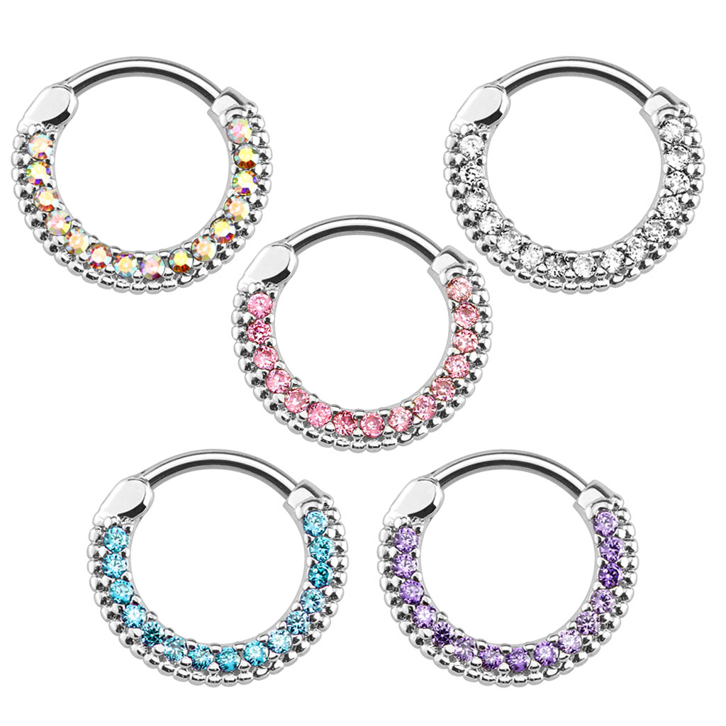 It comes with studded stones along the edge, available in five different colors. The stones are arranged up to the bar; once in the septum, you can only see them and their play of lights. Whatever is the color you select, all of them have a row of dots on the edges, both on the top and the bottom. The design of this septum clicker is elegant and carefully detailed.