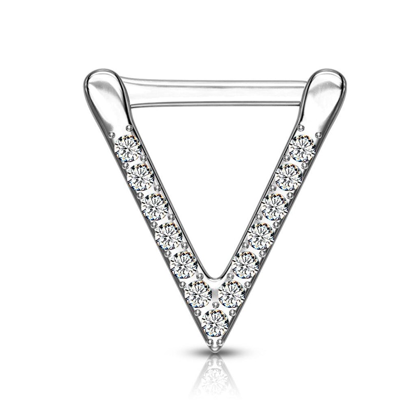 This beautiful septum clicker has the shape of a sharp V. Both sides of the V are studded with tiny clear stones. This clicker has been designed for the septum piercing, but you can also wear it in the ear. When you push the bar into the groove, you will know it's closed when you hear an audible click. At the same time, the bar is hinged on one side of the V.