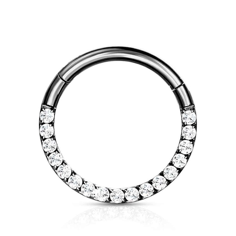 Hinged ring made of titanium with row of stones.