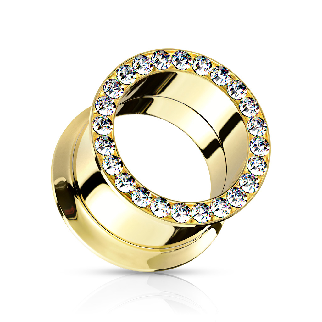 This tunnel is made of gold-plated surgical steel with an edge decorated with studded small white stones.
