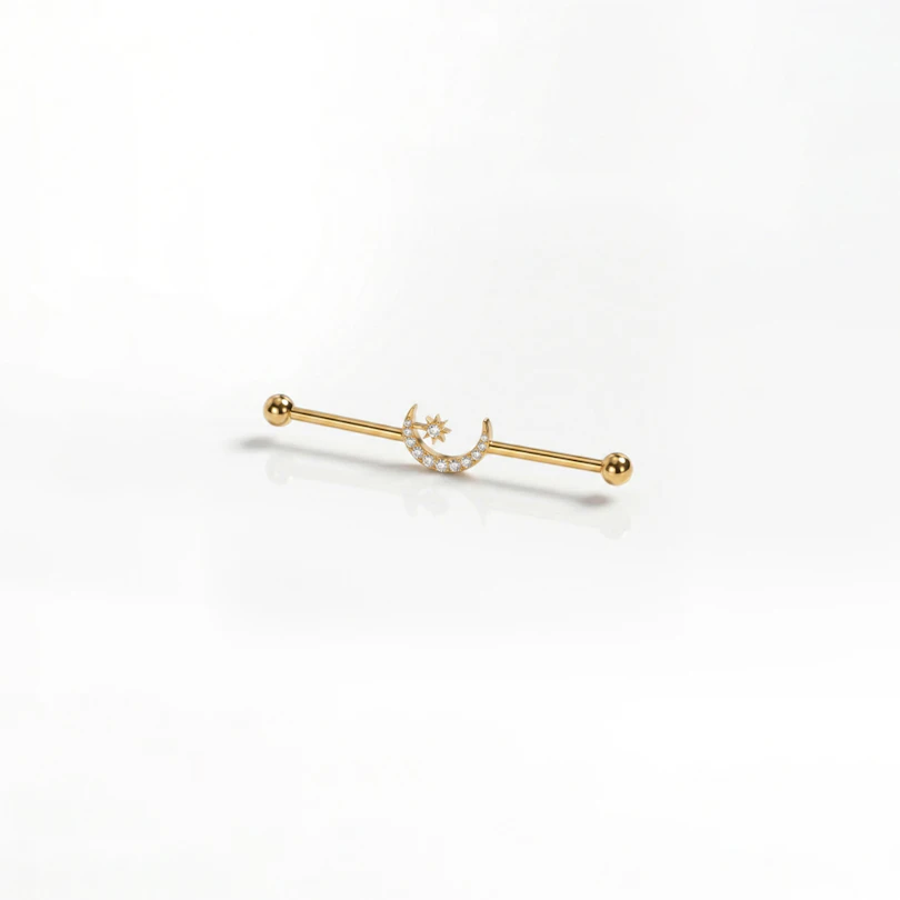 The industrial barbell in titanium with central moon and star brings a clear focal point to your industrial piercing. A crescent moon sits at the center, detailed with small stones, while a tiny star rests just beside it, adding contrast without crowding the design. The layout keeps the barbell clean with the details doing just enough. Available in gold and silver colors.