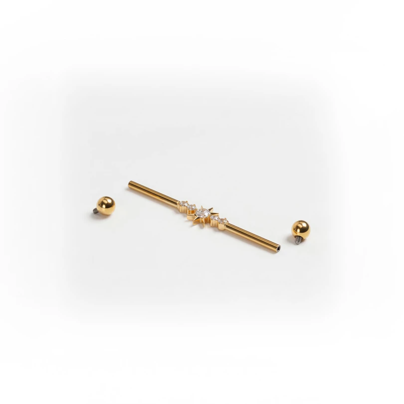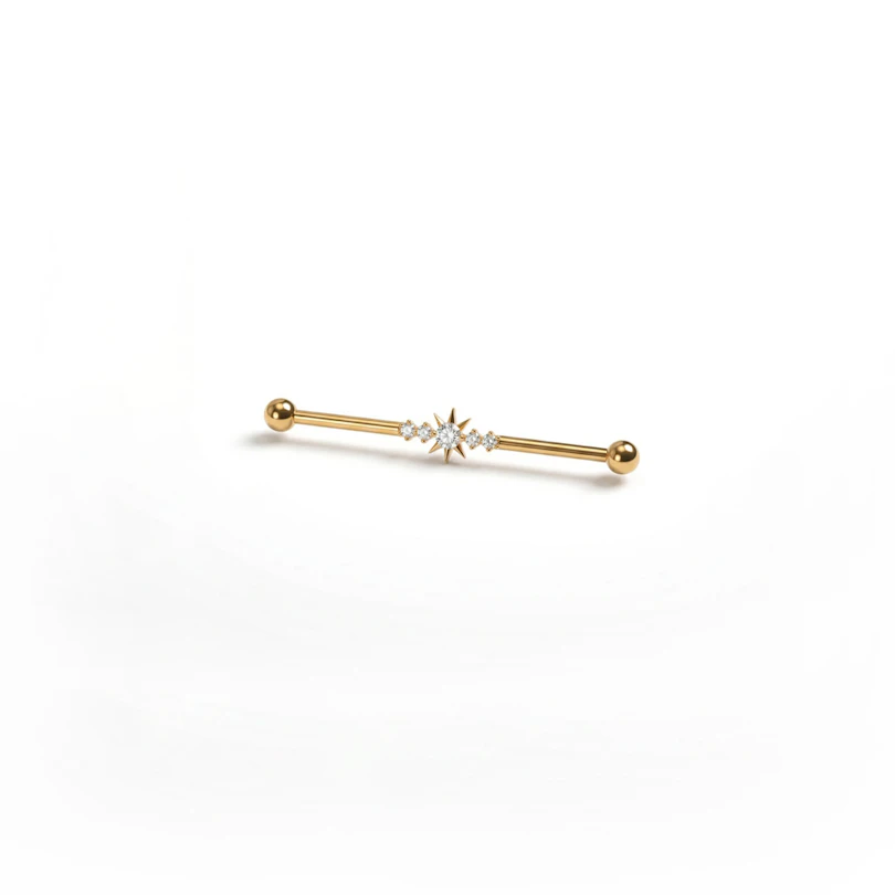 The industrial barbell with central star and gemstones in titanium draws the eye straight to the center. A star-shaped stone sits in the middle, with smaller gemstones placed on either side, all held in a neat prong setting that keeps the design balanced. Available in gold and silver colors, it adds details without taking away from the clean barbell shape.