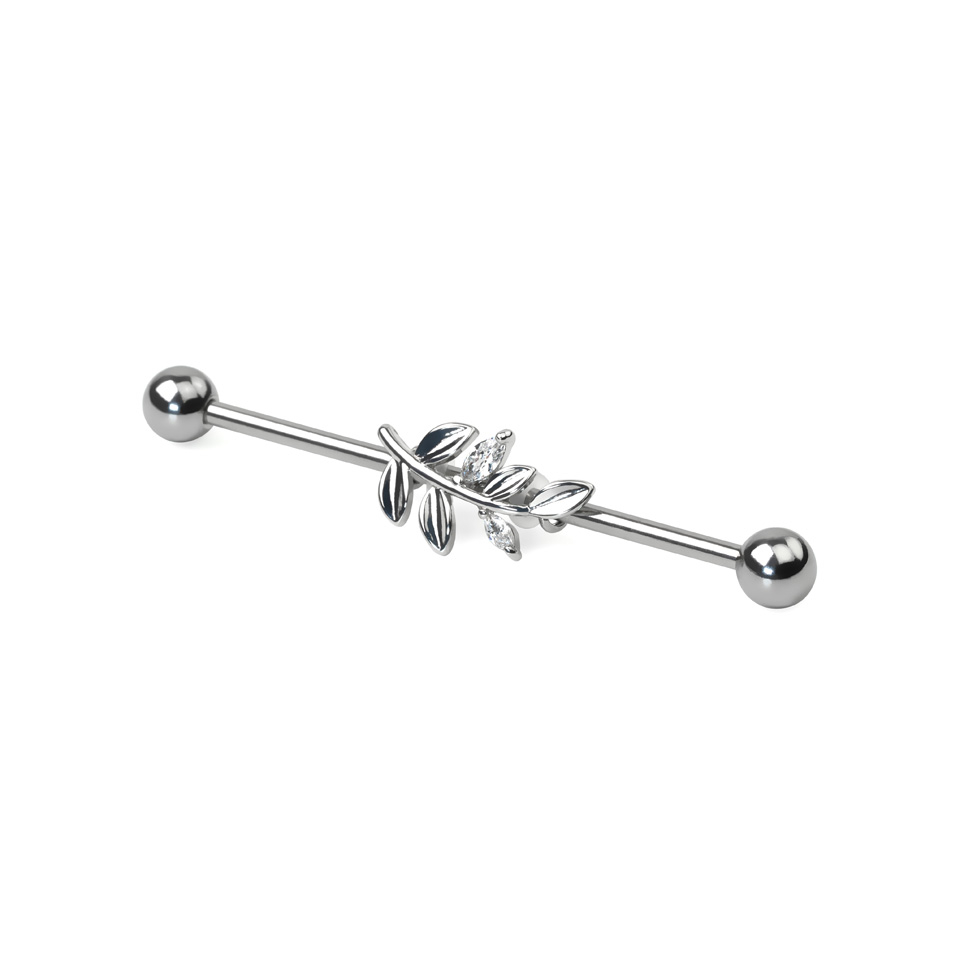 Flowers and leaves have always gone hand in hand with jewelry, and this industrial barbell is no exception. In the middle of the bar is a stem with leaves that can be moved up and own. Two leaves have been replaced with clear stones, which add the jewelry an extra touch. The stem can be fixed where you want with the help of two O-rings supplied.
