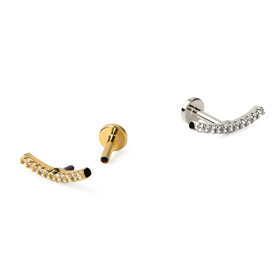 The arch is crafted from brass and the rest of the jewelry is made of surgical steel, subsequently coated in different color options - you may have fallen for the rose gold model, for example. The arch is relatively long, with a length of approximately 9/16" (15 mm). Therefore, it can also be used as an incredible helix piercing, or as a regular ear rim piercing. Where to use it is up to you -- but make sure the dimensions fit your piercing.