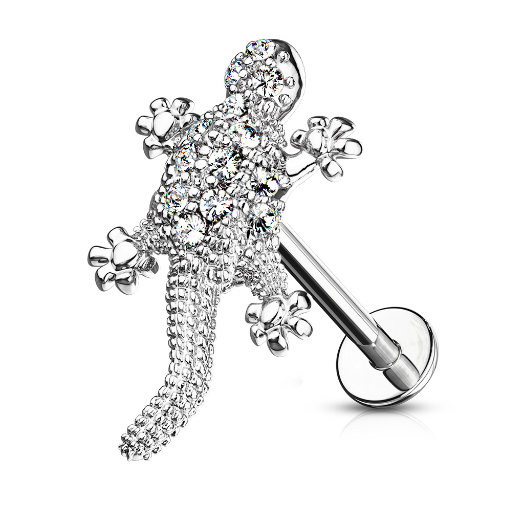 The labret we introduce here is made of surgical steel, and it features a pretty lizard on the front crafted from brass. All the piece is coated in different colors of your choice; the most eye-catching models may be the rose gold or yellow gold models. On the back of the lizard, many tiny clear stones add some dazzle to the lovely animal - these stones are transparent in all the models, regardless of the color that you select.