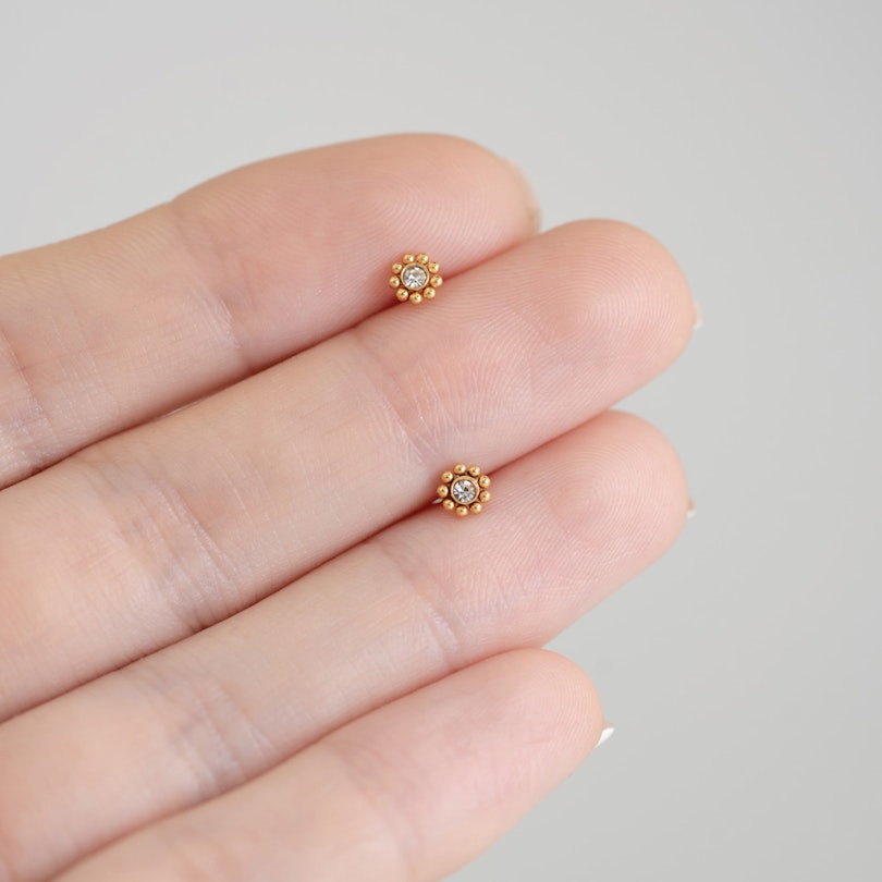 Also common is the clear stone in the front and the internal thread, which is screwed into the bar. The fact that they are internally threaded is an advantage over an external thread, where the thread can scrape or tear the inside of your piercing hole - an internal thread will prevent this.