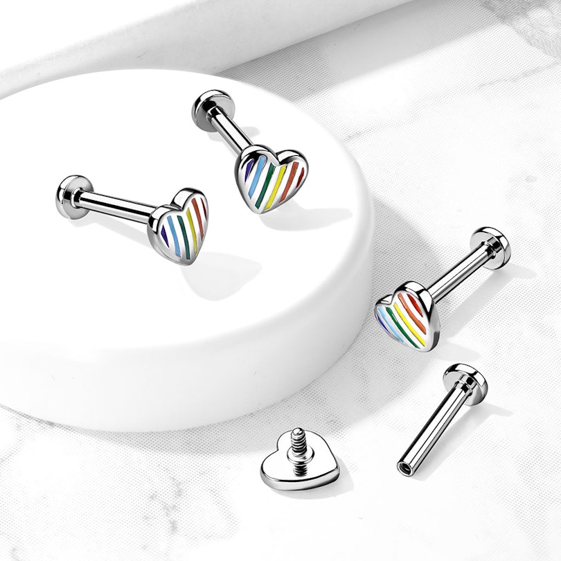 Name: Labret with internally threaded striped rainbow heart