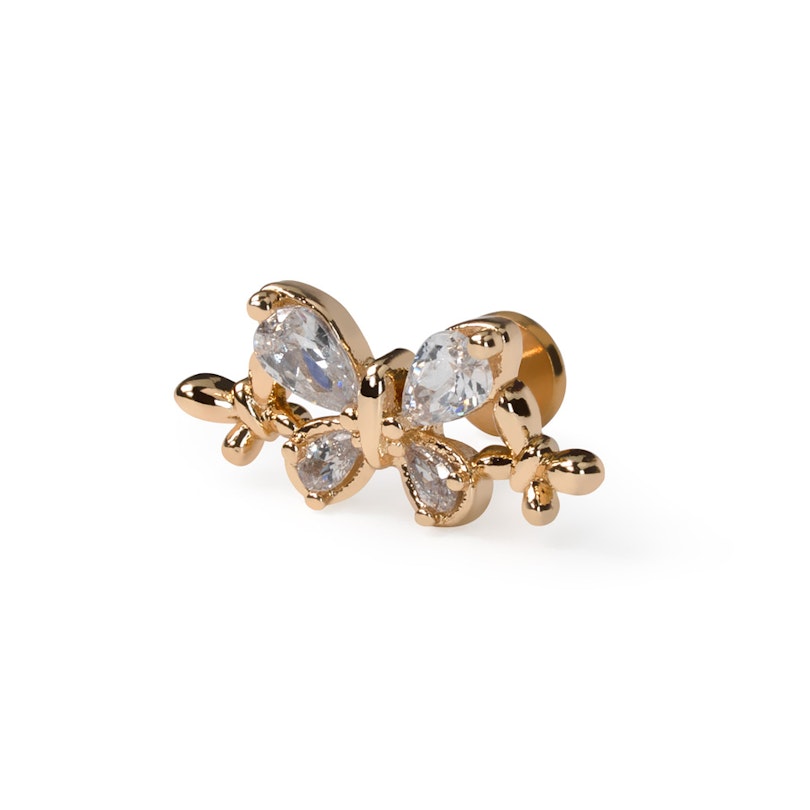 The labret with three butterflies is all about playful detail. At the center sits a larger butterfly, formed from clear prong-set stones, while two smaller gold-tone butterflies rest on either side, creating a delicate trio full of character.