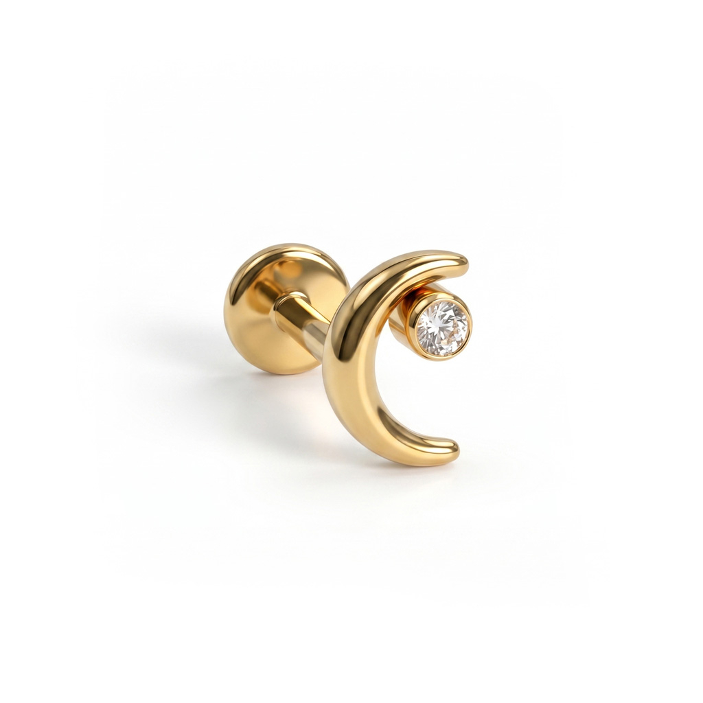 The moon labret with star in titanium brings both shapes into one small, curved form. The moon sits close to the skin, with a small stone set within to represent the star, creating a compact detail. It fits easily into different setups and still feels distinct. Available in gold and silver colors.