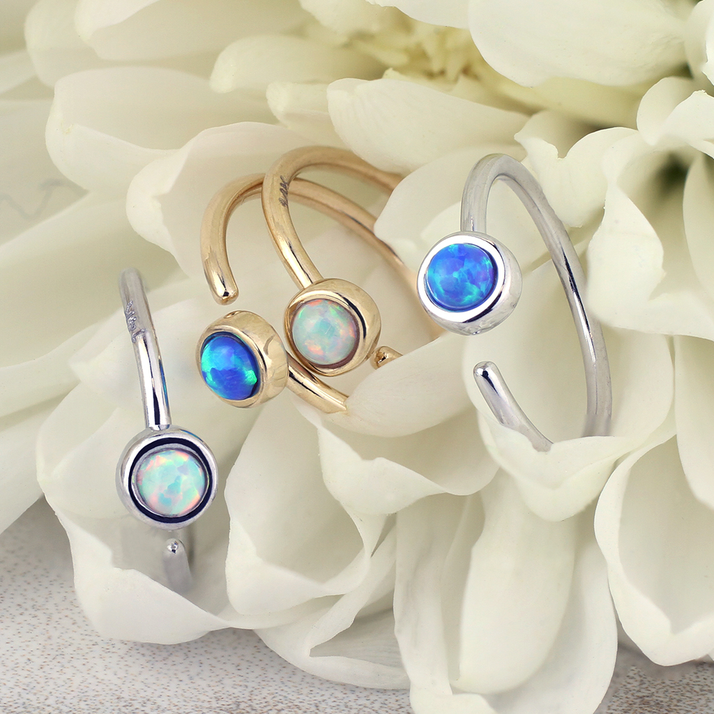Besides choosing the type of gold, you can also pick the color of the opal stone between white or blue. The white opal has reddish, yellow, and green hues, but white is the most prominent color. The blue one has light blue, turquoise, and dark blue nuances.