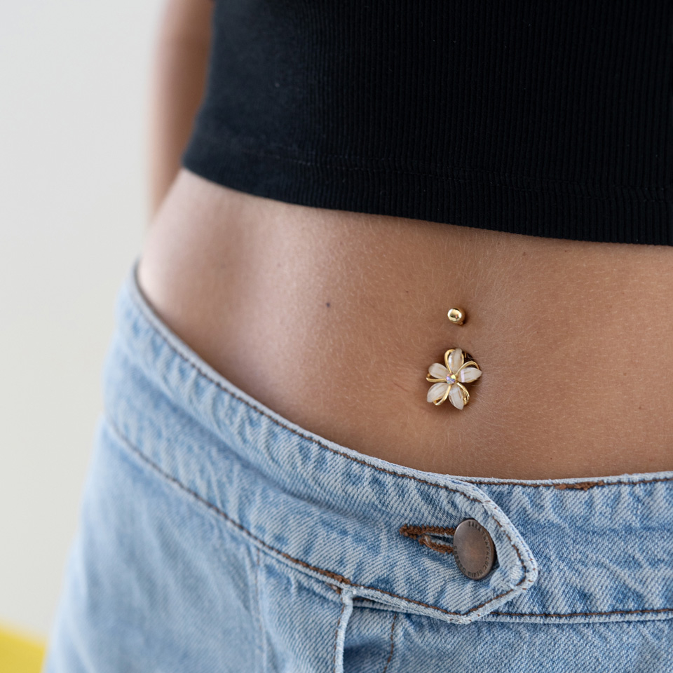 A gold-plated belly button ring is nothing new. But this is a different model because the barbell has three prongs on the bottom end that hold the large gem, making it look bigger. This method keeps large gems in place, with only three visible thin prongs.