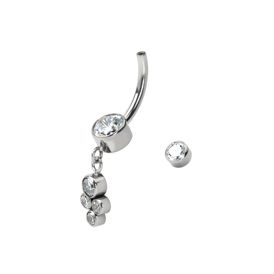 Belly button ring made of titanium with a dangling cluster of bezel-set stones