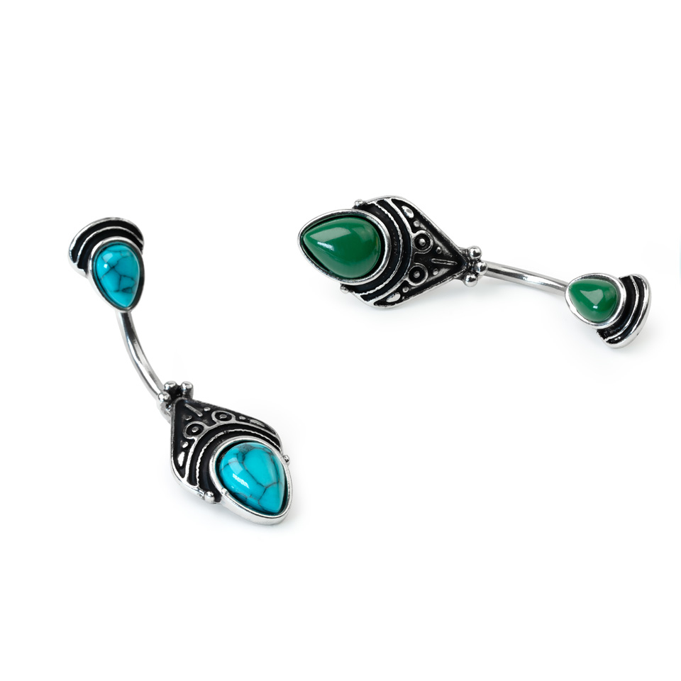 You can choose from different oval stone colors. Among other options, it's available in turquoise, which stands out on the black background that provides a beautiful contrast and play of colors. You can take a look at the pictures to have an idea about how the stones look.