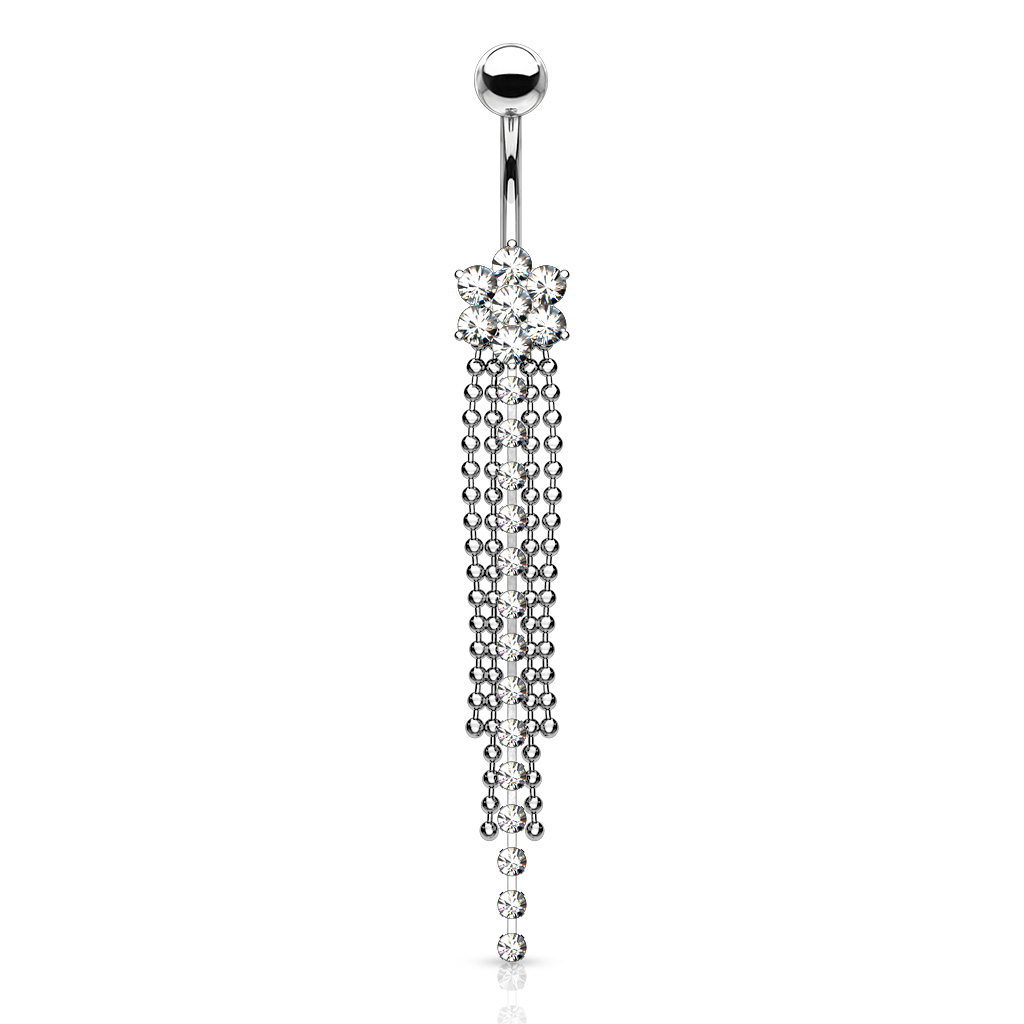 With this beautiful belly button ring, you will get an incredibly elegant effect on your belly. You can dress up your belly without getting an excessive bling look. This belly ring has a beautiful flower-shaped bottom ball, and gorgeous chains hang from it. The flower is formed with seven little stones, fixed with tiny prongs that create the different parts of the flower.