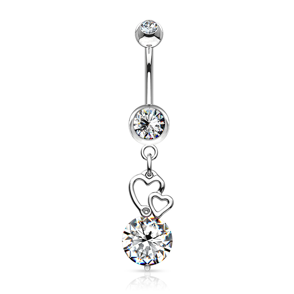 The belly ring is incredibly beautiful in both colors, with a barbell with two bezel-set stones on the top and bottom balls. It has a dangle with two lovely hearts and a large gem on the bottom end.