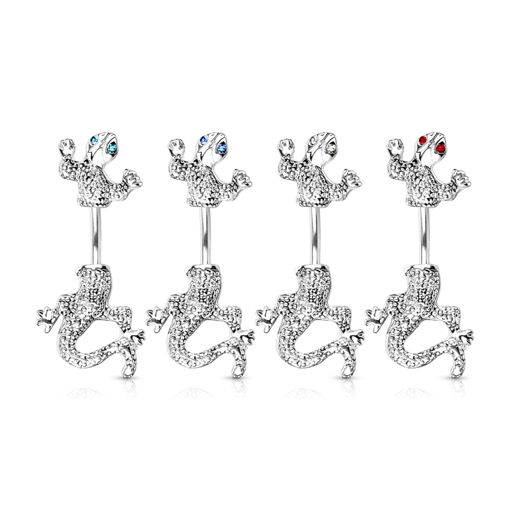 This small lizard also has beautiful eyes that you can choose between blue, red, or white. They're two gems cut from different angles that create a fabulous contrast with the rest of the belly ring, especially the red eyes.