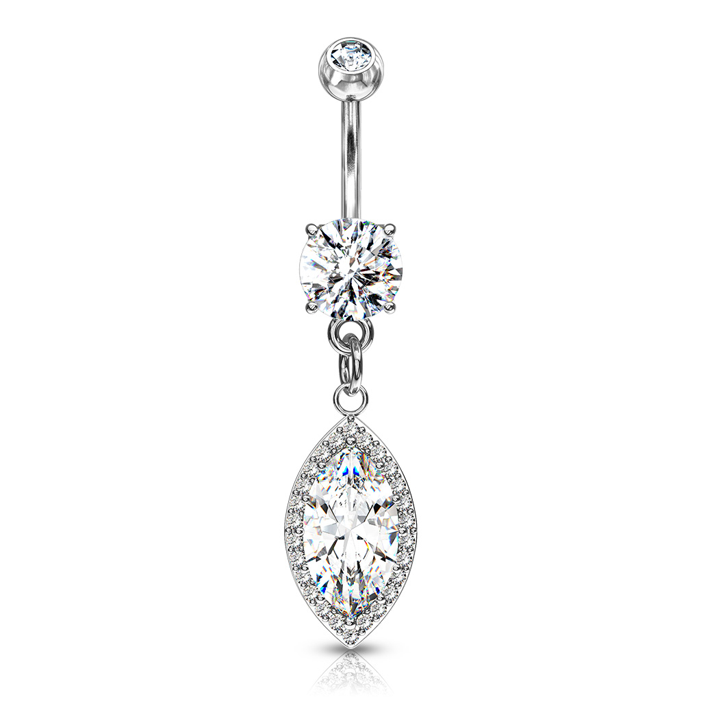 Around the marquise are additional tiny stones. All the stones in the belly ring are clear stones, including the barbell's top and bottom balls.