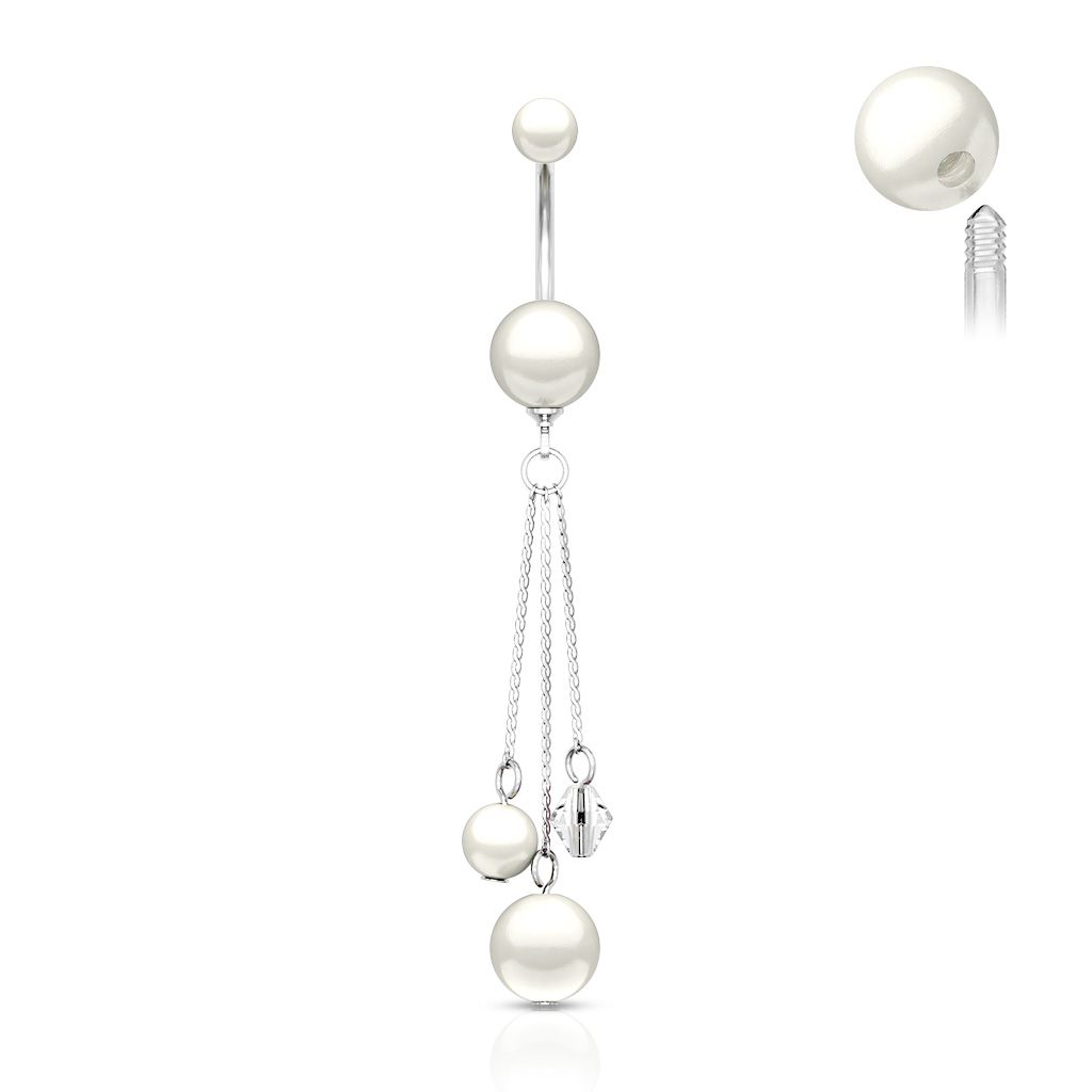 This is a sweet belly button ring made of surgical steel with acrylic pearl beads. It's a sweet and classic belly ring with several chain dangles. From the bottom ball, three chains hang in different lengths in asymmetric design. One of the balls has a diamond shape. All the balls and beads are the same color.