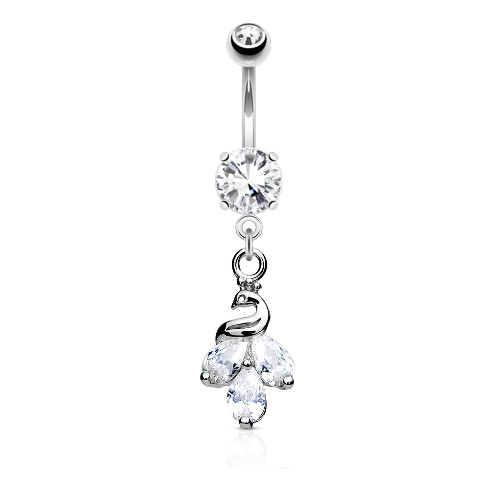 The featured peacock in this belly ring is a bit more discreet. Its feathers have been replaced with three drop-shaped clear stones, which are just as magnificent as if they were real. With this belly button ring, you’ll be ready to attract your partner ;)