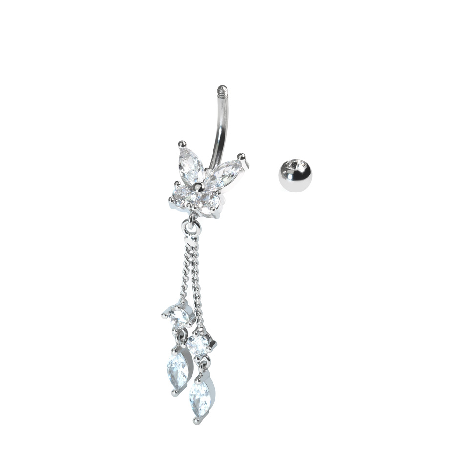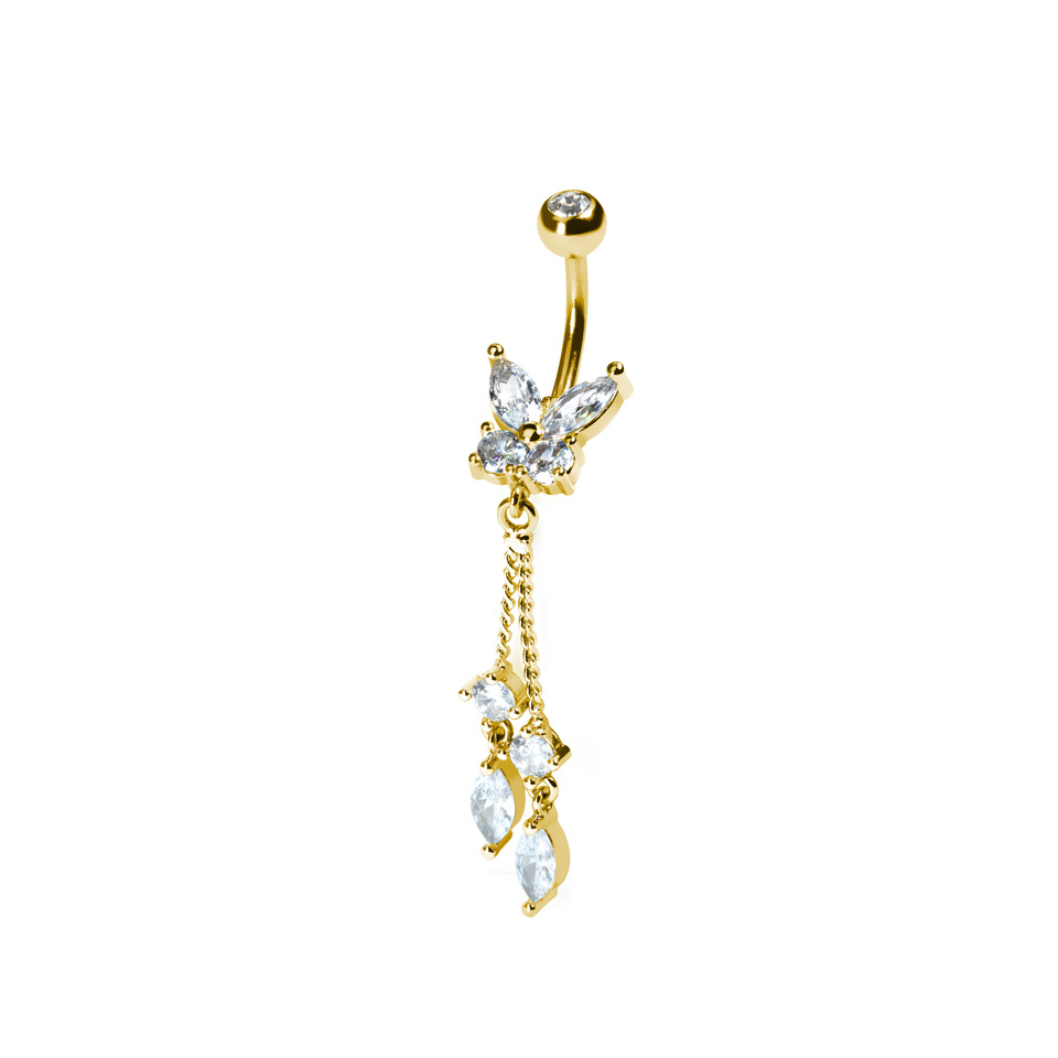 This sparkly belly button ring features a beautiful butterfly on the bottom ball, with more sparkly stones in the charms which hang from the butterfly with delicate chains.