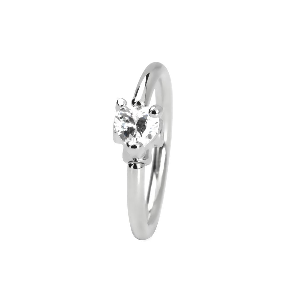 This captive bead ring features a heart-shaped gem instead of a regular ball. This is held in the ring by tension, but the heart can spin in place.