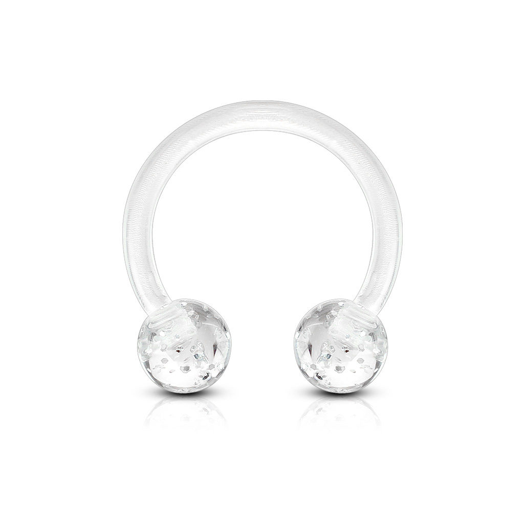 In the picture above, you can see a stunning circular barbell made of acrylic with glitter balls. This circular barbell is available in different colors, such as blue, red, and pink. The color of the barbell won't be identical to the balls'. For example, the blue barbell has a lighter blue bar than the glitter balls. On the other hand, these circular barbells are flexible, which makes it easy to put them in your piercing.