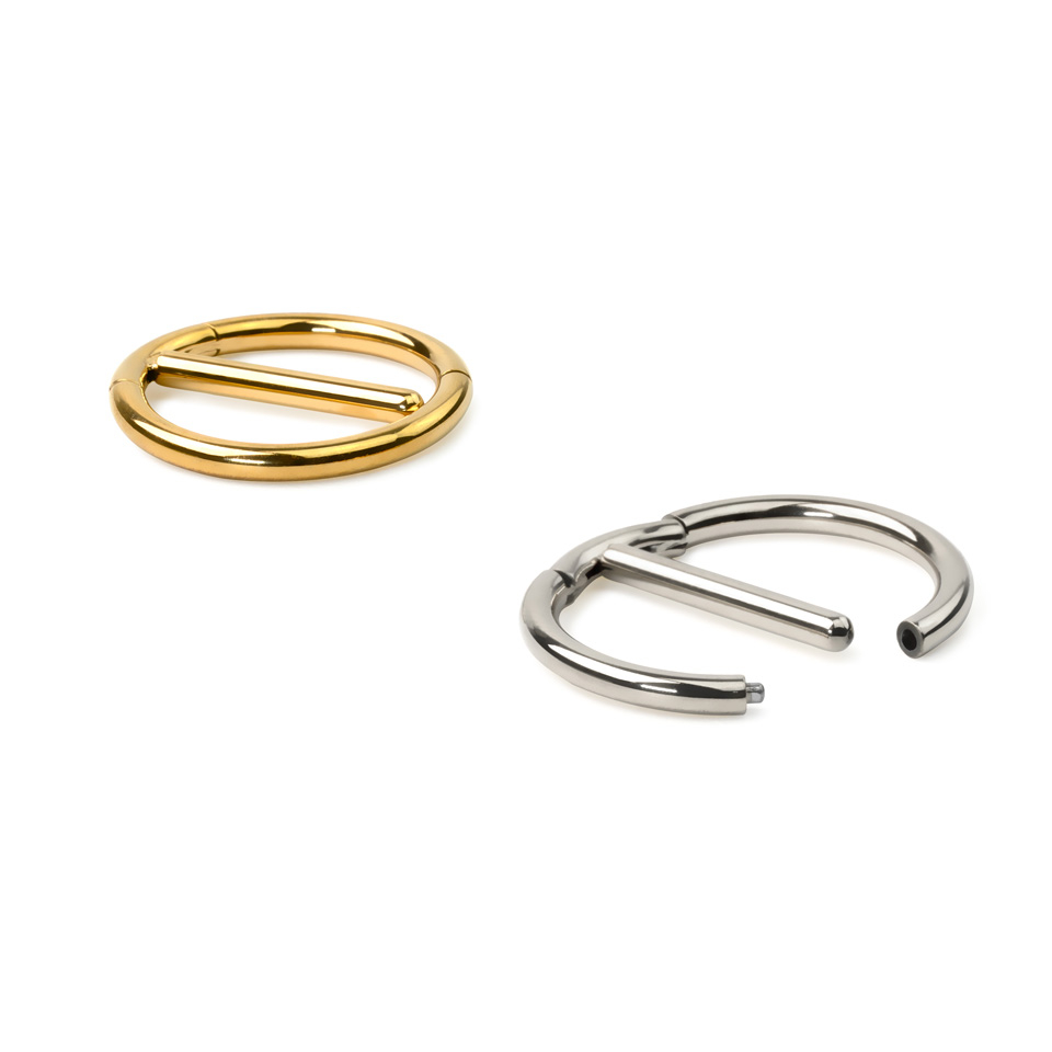 This jewelry is probably the most user-friendly nipple shield piercing to date! Simply open the ring, insert the bar in your piercing and close the ring around the nipple. The non-removable hinged segment makes both insertion and removal a snap. We are head over heels for this product - are you?