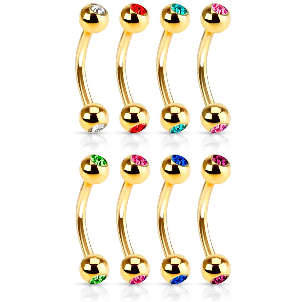This barbell is made of surgical steel and has been covered with a layer of gold. It has a bezel-set gem in the balls on each end. This is specially designed for eyebrow piercings, but you can also put it on your nipple or intimate piercing.