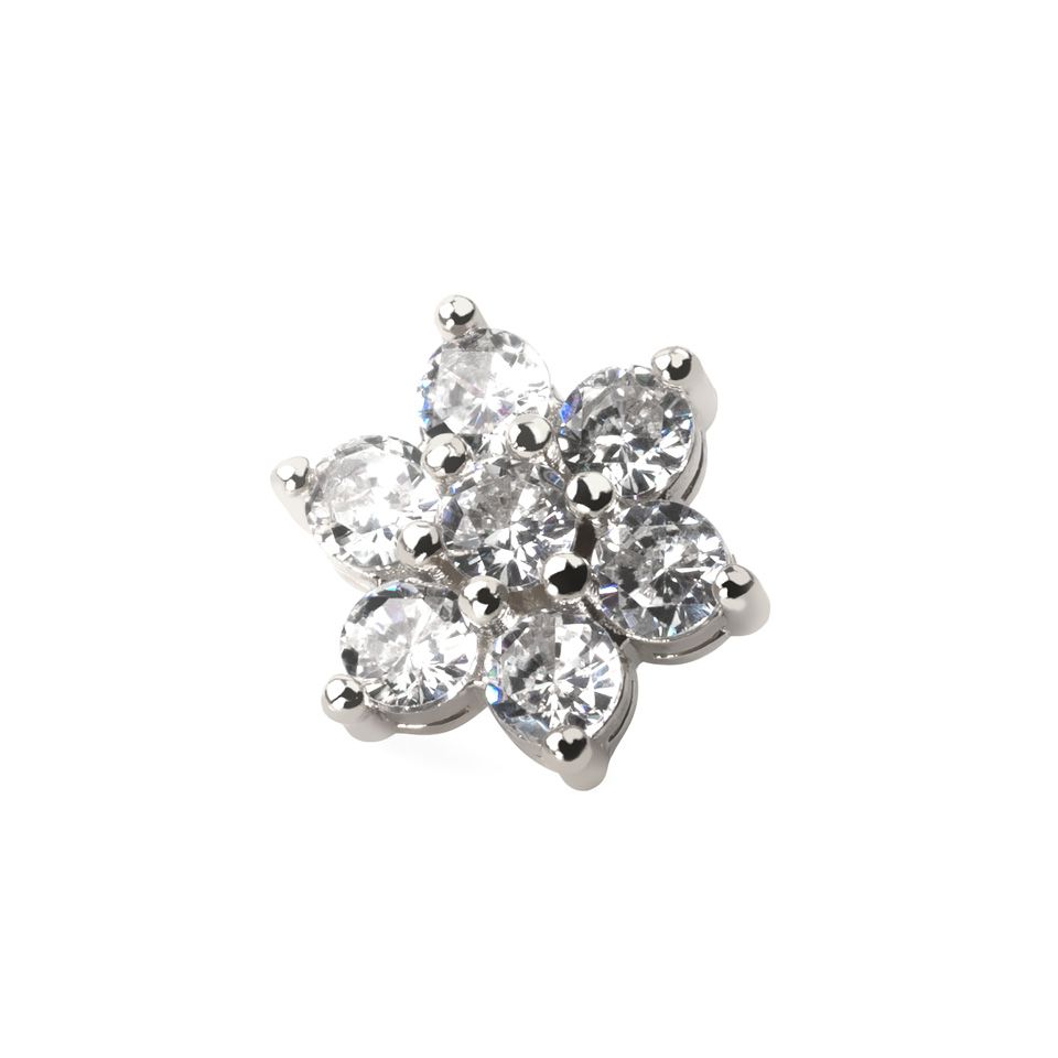 The small screw rod located at the back of the charm - the one that goes threaded into your dermal anchor - is made of high polished surgical steel, and the flower charm is crafted from brass. The brass has been coated in all the models to get rid of the ugly yellowish tone. The aforementioned golden editions are gold-plated in 14-karat gold, which gives them more exclusivity. Every coating and bright stones give the dermal top a brand new look. Besides, you also have the opportunity to choose your favorite base/center stone combination.