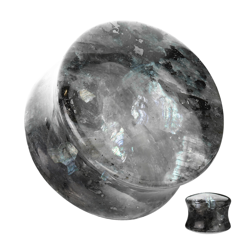 Double flared plug in natural black labradorite