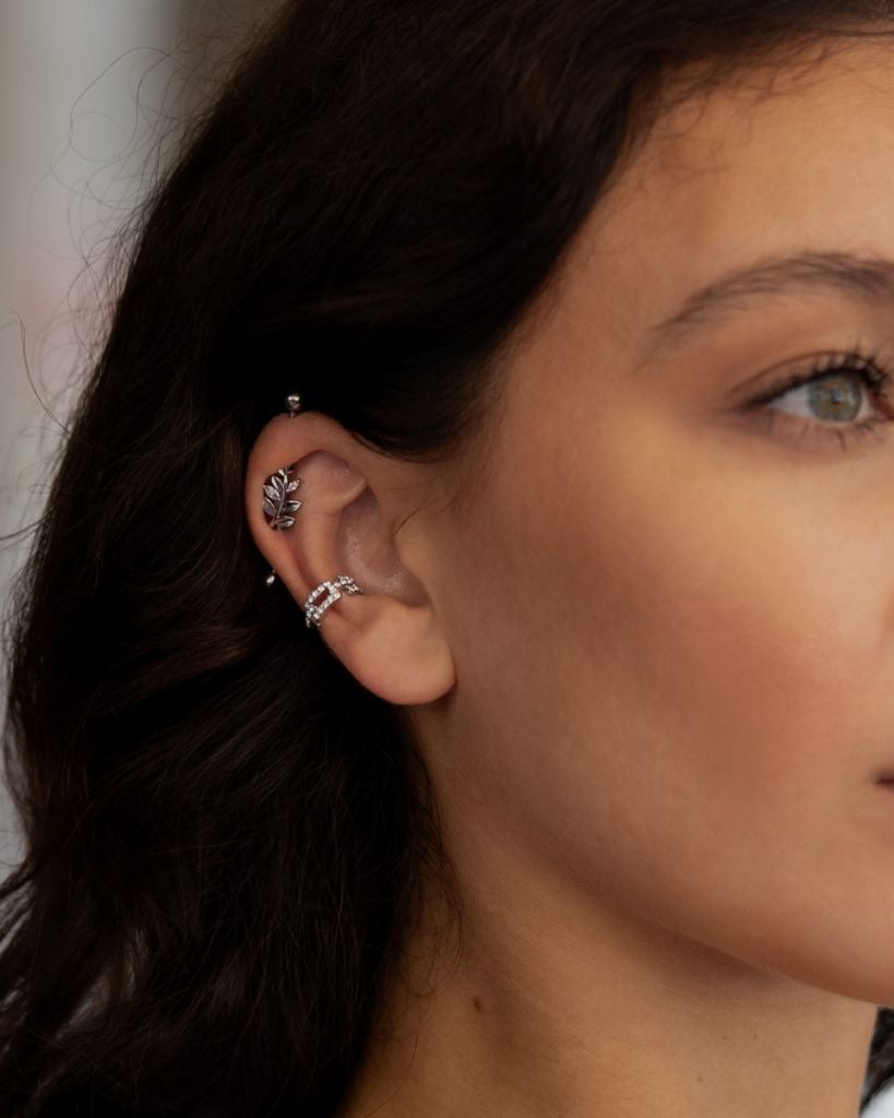 This ear clip is perfect for you if you'd like to see what an ear piercing would look like on you. With this ear cuff, you can wear piercing jewelry without going through the hassle of getting your ear pierced with a needle. To put it on, simply press the ends to fit your ear, it's that easy! The piece is made of brass and has been coated in different materials - you can choose between a silver, gold, or rose gold finish.