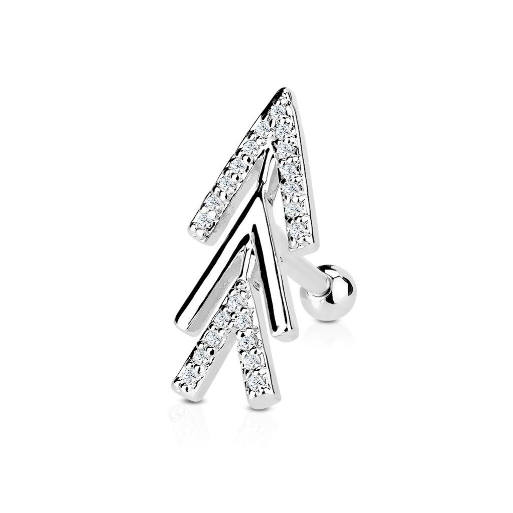 If you're looking for striking ear piercing jewelry, you came to the right place. The barbell we introduce here is decorated with a beautiful abstract design on the front side: a triple arrowhead. The heads get gradually bigger towards the top. Two of them, the top and bottom heads, are entirely studded with stones. The one in the middle is plain, adding the design a beautiful appearance. The design on the front side is crafted from brass and coated to match the rest of the piece. The barbell is made of surgical steel, which has also been coated. This gives you the chance to choose from different colors, such as a beautiful rose gold that is plated in 14-karat rose gold.