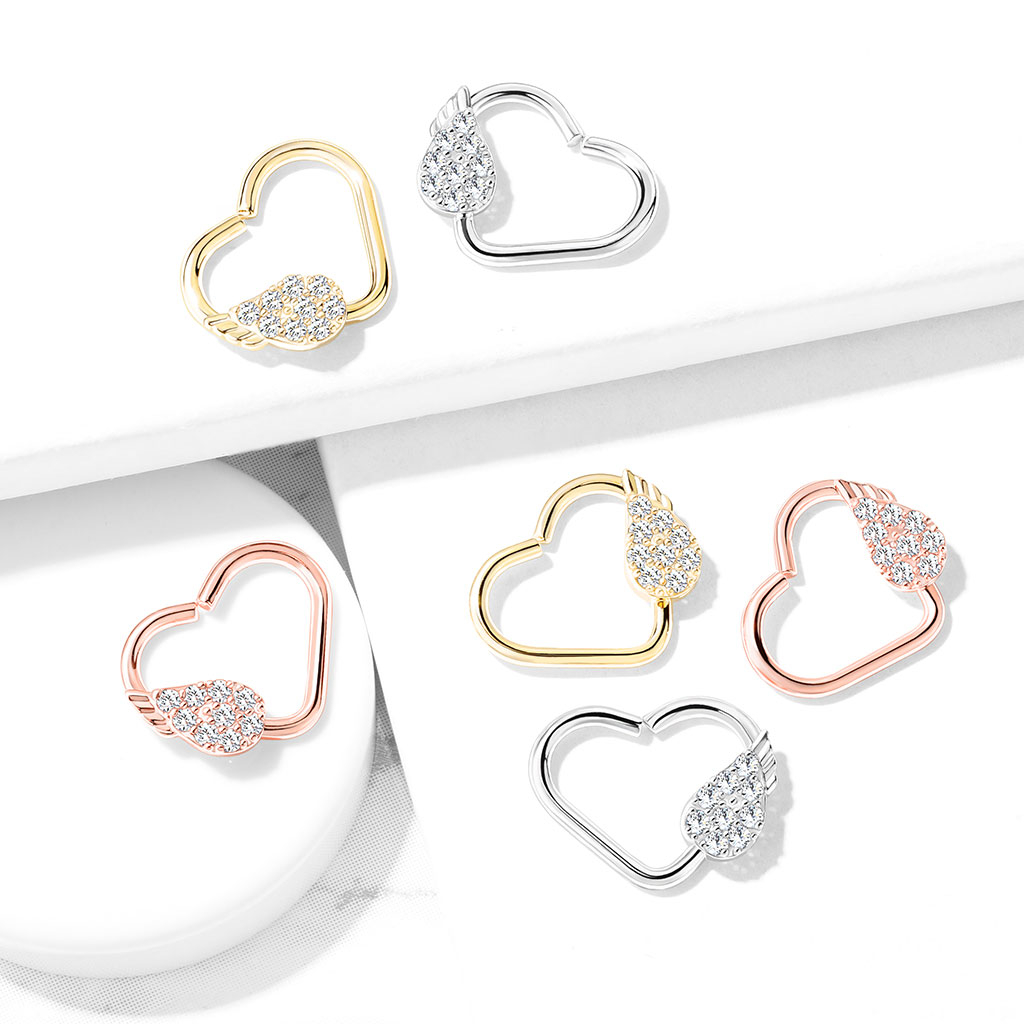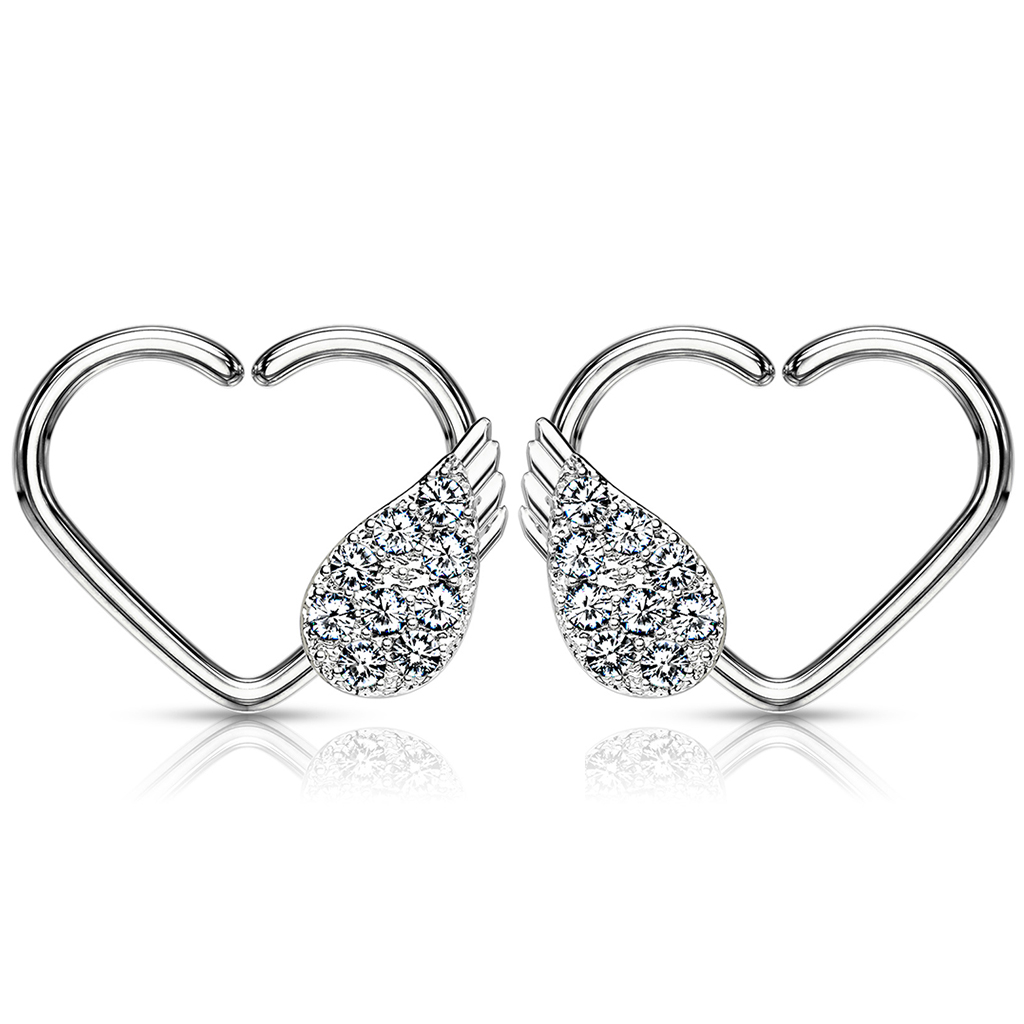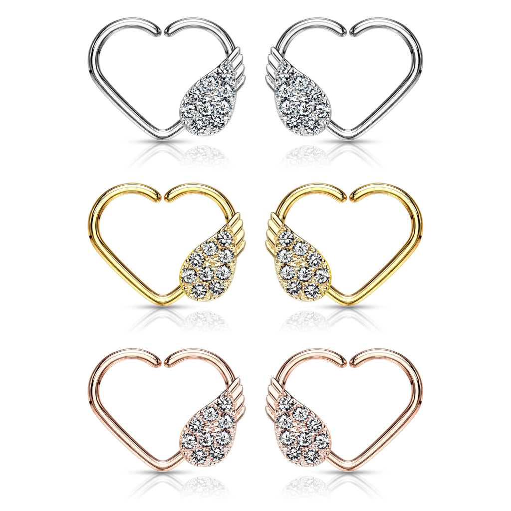 One side of the heart has a small angel wing, coated with tiny clear stones. If you choose the right ear piercing model, the wing will be placed on the right, and vice versa. That means that you won't be able to use the same piece for both ears. Well, you can, but the wing will be faced backward, and that's not the intention. The inside measurements of this heart are 11mm width by 8mm height. The heart and the wing are plated in platinum for the silver-colored model, and in 14-karat gold for the two golden models.
