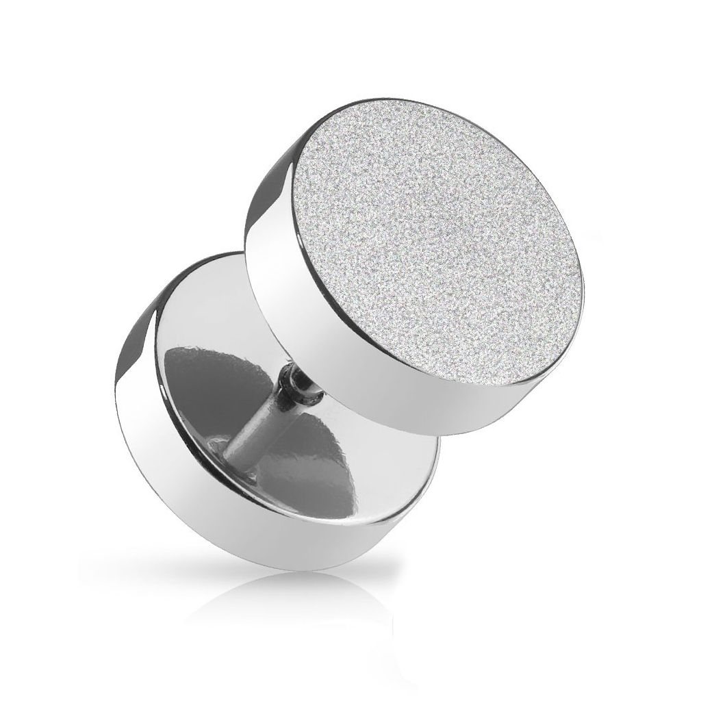 This fake plug is made of surgical steel and consists of two round plates at the front and the back. They are connected with a 16 gauge (1.2 mm) bar, which is 1/4" (6 mm) long. The front plate has been sandblasted to give it a diamond-like look, which means that it will reflect light and twinkle depending on how you move it.