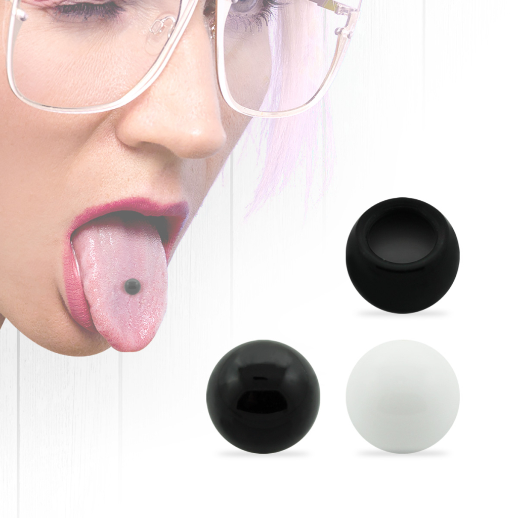 We introduce a fake tongue piercing, which means that you don't need to have a piercing in your tongue to be able to put it on. With this fake tongue piercing, you will see, and feel, what a tongue piercing feels like. It's available in two different colors: white and black. The ball is made of acrylic, but it's not a ball, but half a sphere with a hole inside. The hole allows a vacuum to be created so that the jewelry stays on your tongue and looks like a real tongue piercing.