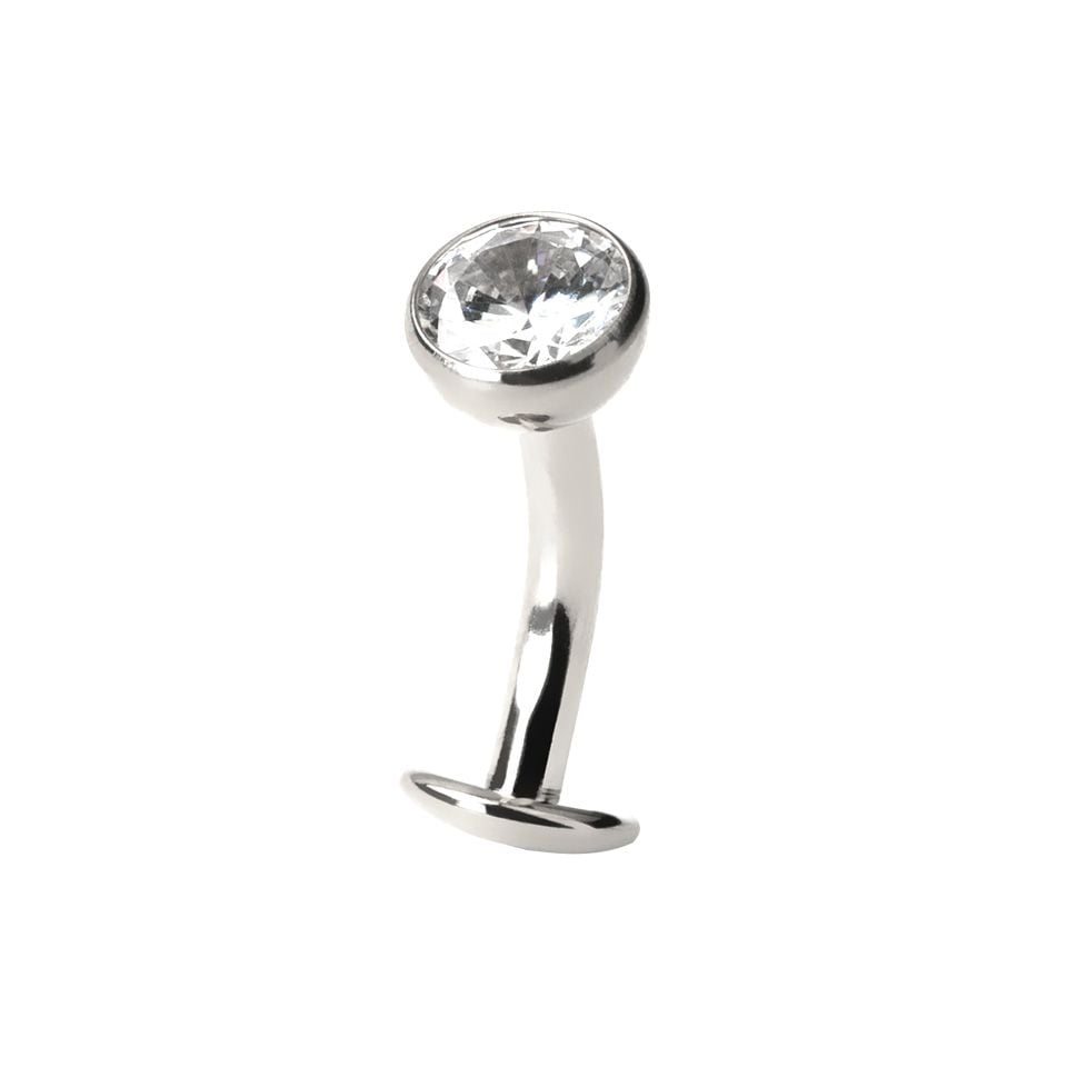 This floating or reverse belly ring features a bezel set CZ stone in the top ball, which will sit above your belly button. The other end of the barbell features a flat disc that sits discreetly within your navel, giving the impression that the jewel is floating.