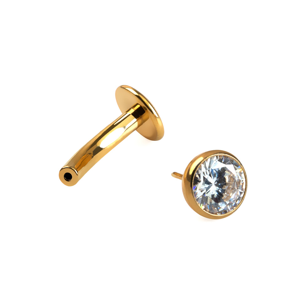 This floating or reverse belly ring features a bezel set CZ stone in the top ball, which will sit above your belly button. The other end of the barbell features a flat disc that sits discreetly within your navel, giving the impression that the jewel is floating.