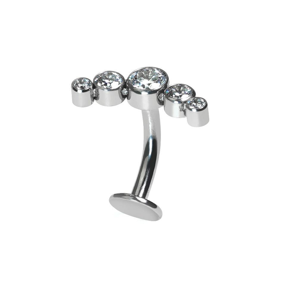 This floating titanium belly ring features five bezel-set crystals. As it is made from titanium, it is hypoallergenic and waterproof. This piece closes with a push-in mechanism, meaning that to secure it into your piercing, you just need to bend the pin slightly and insert it into the stem.