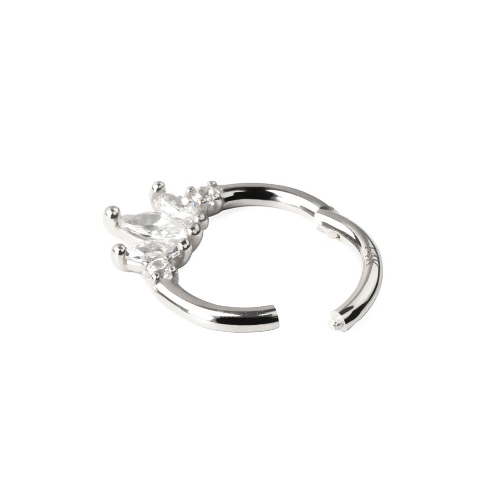 The ring has five stones at the bottom. There are two round stones on each side and three oval-shaped stones between them. The oval stone in the middle is larger than the rest. All together form a beautiful cascade of clear stones that embellish any piercing.
