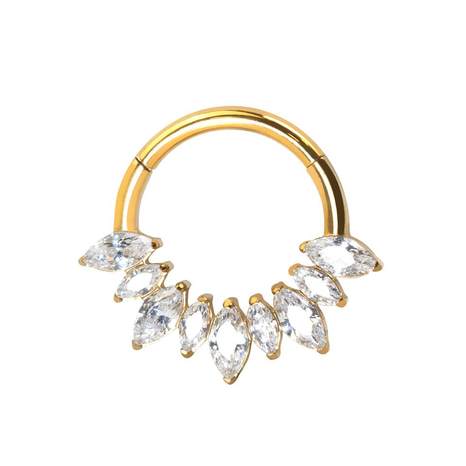 This beautiful ring features 9 marquise cut CZ stones in a pattern of alternating large and small sizes. This piece is ideal for piercings where you want the design on the front of the ring rather than the side, such as septum or daith. It has a hinge which means it is straightforward to insert into your piercing, and is made from titanium so is suitable even for sensitive skin.
